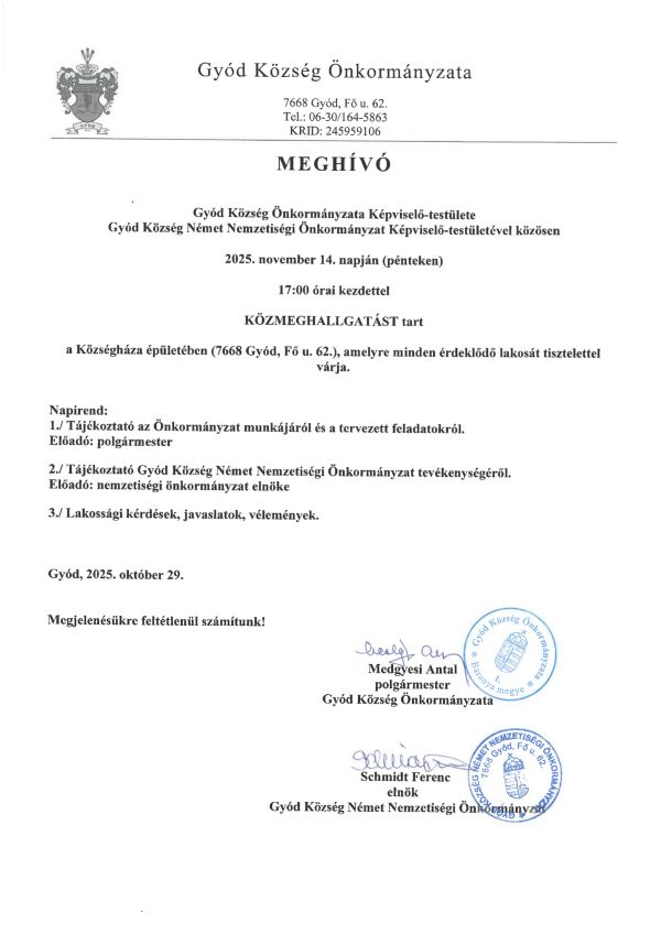 Hivatal: 7668 Gyód, Fő u. 62. Telefonszám: +36 30 164-5863 Hivatali idő: H, K, Sze: 8-15; P: 8-12